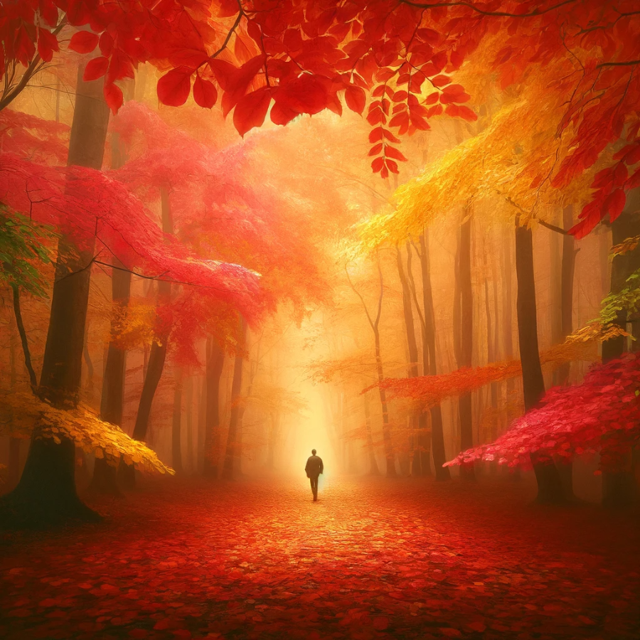 변화의 시기를 의미하며, 새로운 시작을 암시합니다. 낙엽은 과거를 상징하고, 그것을 밟으며 걷는 행위는 과거를 뒤로하고 나아가려는 의지를 나타냅니다.