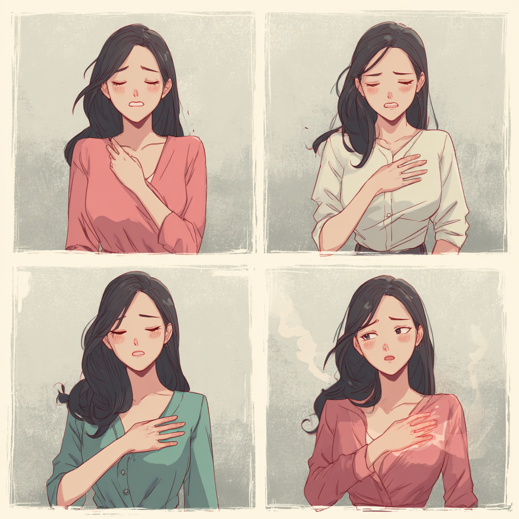가슴 중앙의 눌림, 통증, 호흡 곤란, 체한 느낌